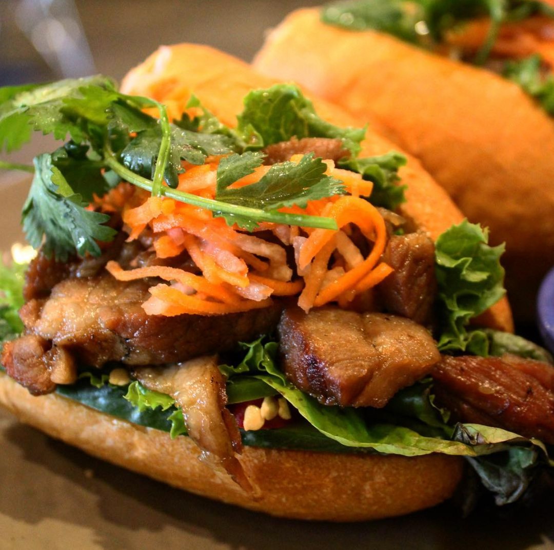 Pork or chicken wrapped in a crispy french baguette with lettuce cucumber pickled jicama and thinly sliced jalapeño peppers.
