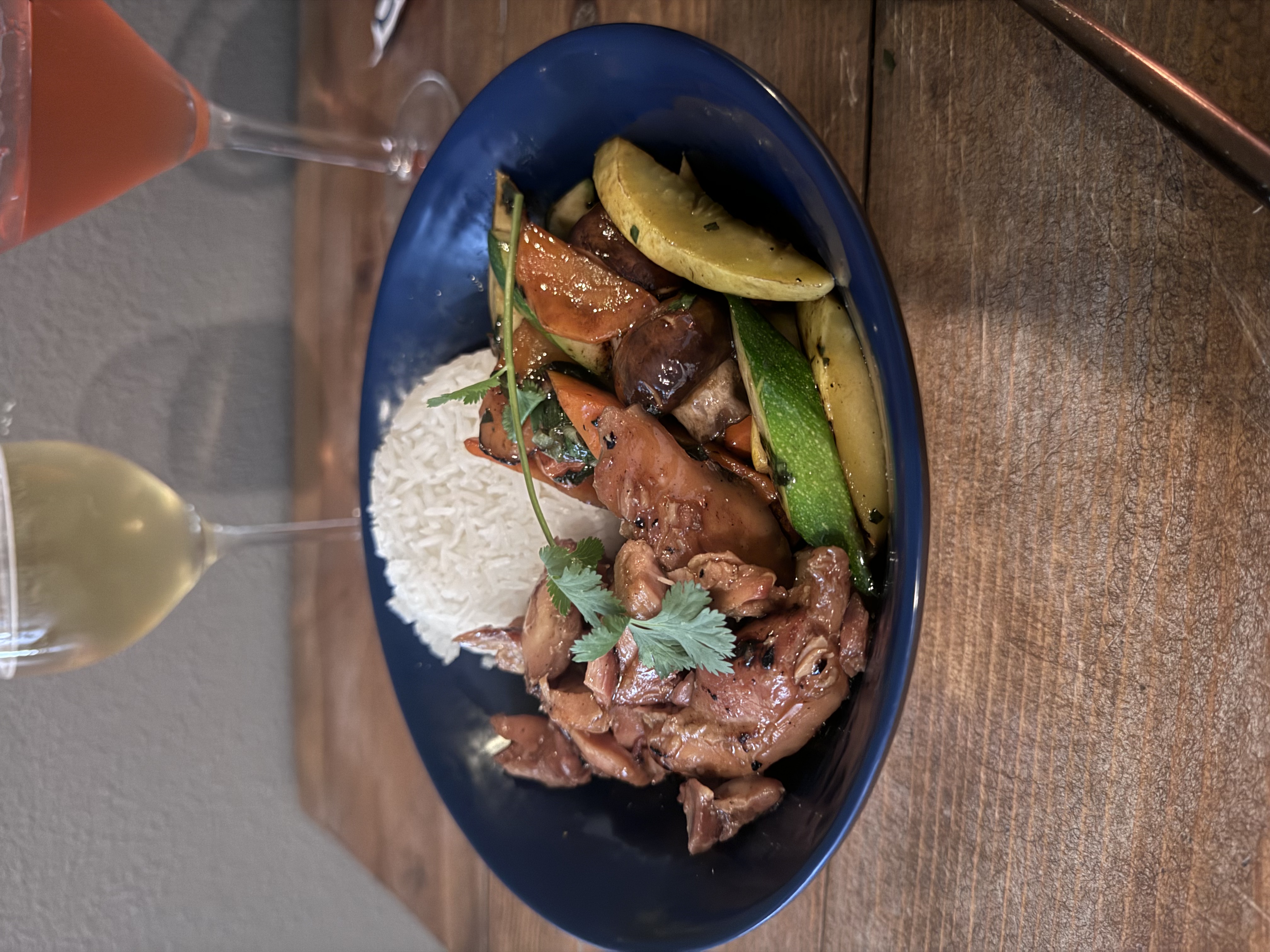 Grass fed filet mignon cubed, served with Jasmine rice and seasonal sautéed veggies.